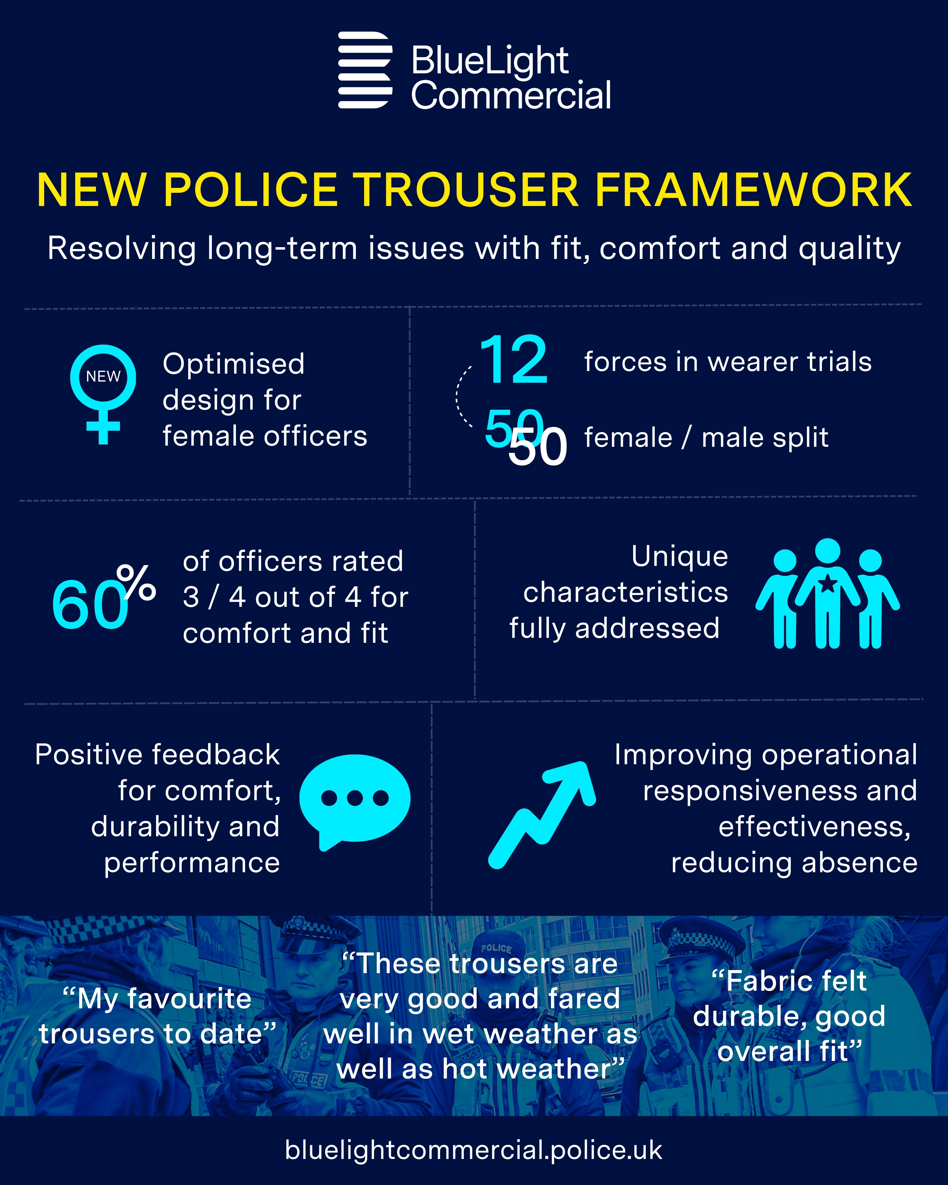 The existing specification for general patrol trousers was outdated and hadn’t been revised in over 10 years; BlueLight Commercial prioritised the procurement of trousers to provide a robust solution, which: